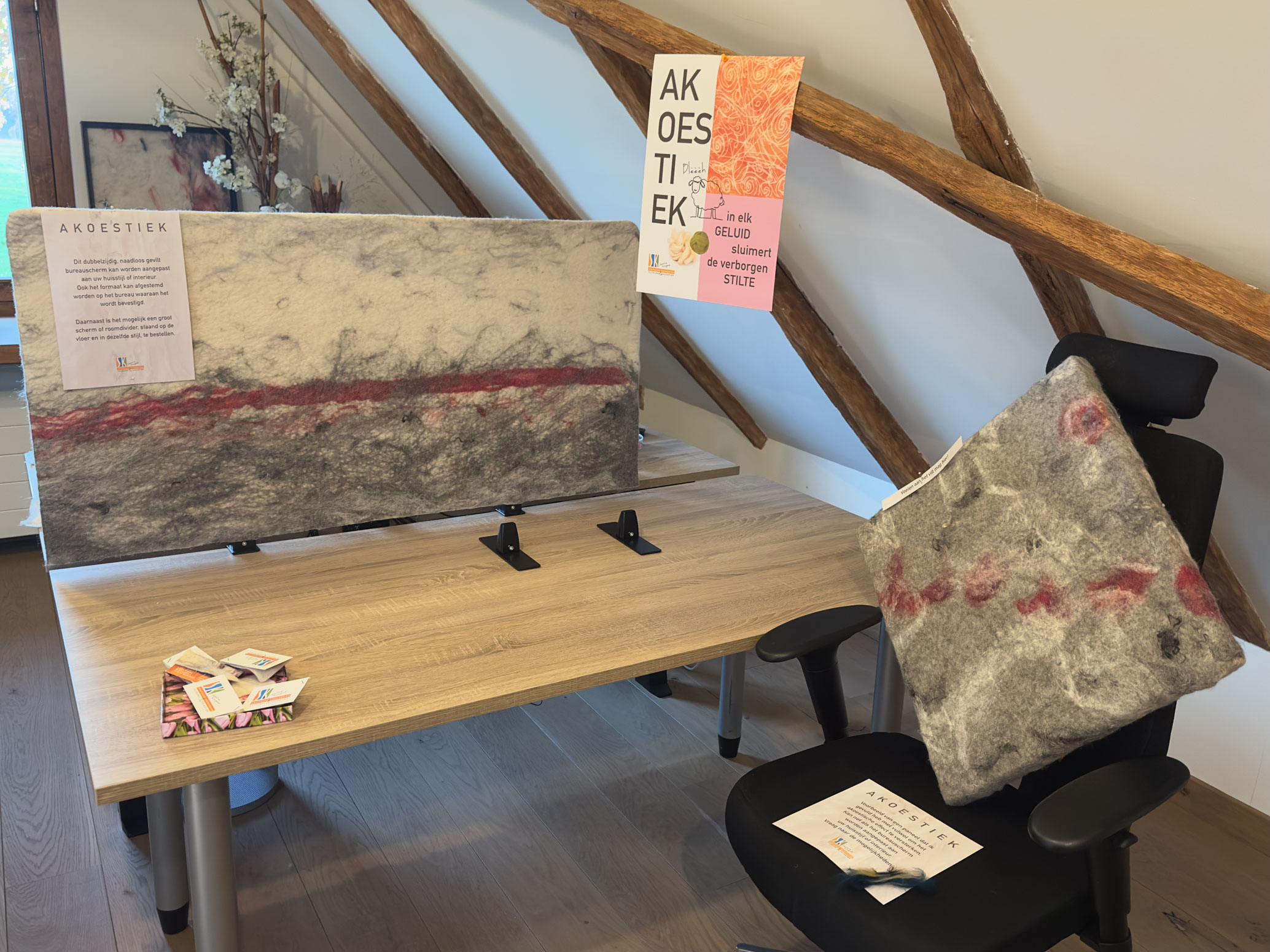 Bureauschermen bekleed met vilt maak ik op maat. Deze bureauschermen bieden privacy en dempen geluid. Ze zijn verkrijgbaar met klemmen om aan een bureau vast te maken of met poten om los op het bureau neer te zetten. Ook een op de grond staand frame behoort tot de mogelijkheden. De vilten bekleding is geheel naar wens aan te passen, passend bij het interieur of de huisstijl van het bedrijf. Ik vertel je graag wat de mogelijkheden zijn.
